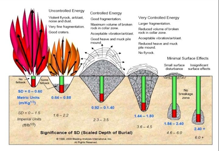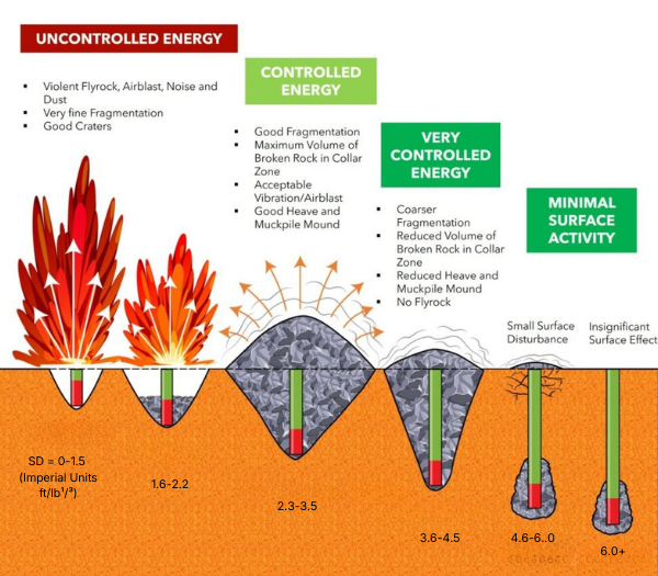Scaled Depth of Burial (SD) is defined as the ratio of stemming material to explosive within a space equivalent to 10 hole diameters. Higher values of SD indicate deeper burial depths, resulting in controlled energy and reduced surface activity.